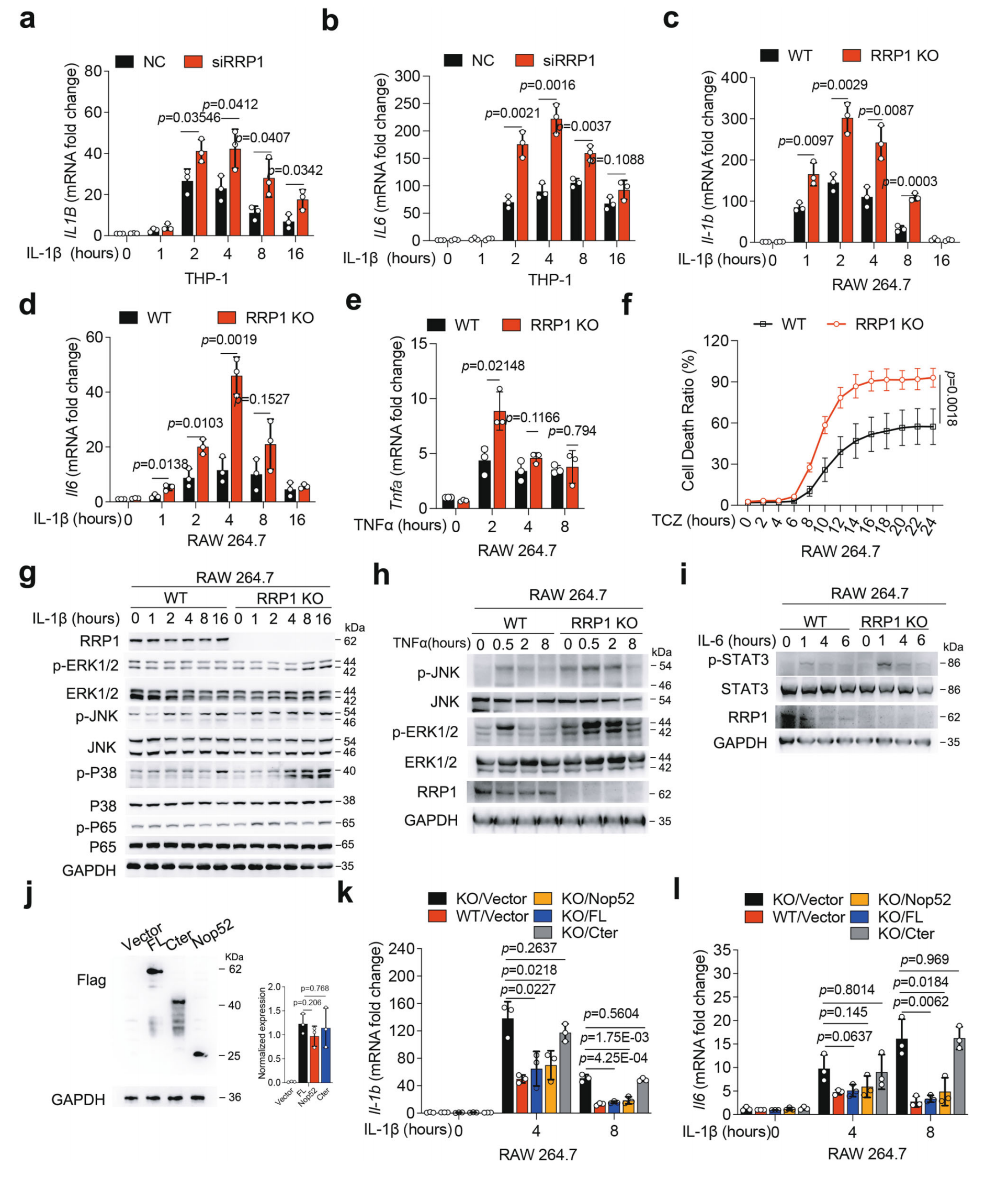 对IL-1β刺激0h(静息)、1h(起始)、12h(消退)的巨噬细胞进行GRPIp分析,鉴定出386个潜在RBPs,其中12h组特异性富集的RRP1在敲低后显著升高促炎因子Il-6, Il-1β, Ccl2 mRNA和蛋白水平,提示其负调控炎症。