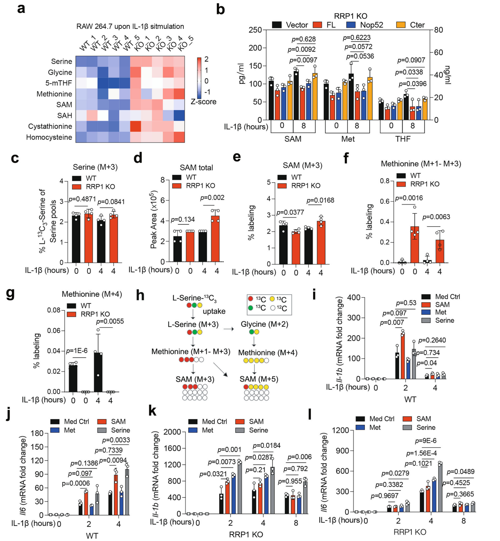 代谢组学分析显示RRP1 KO巨噬细胞中一碳代谢物丝氨酸、甘氨酸、5-甲基四氢叶酸、SAM(S-腺苷甲硫氨酸)等水平显著升高。同位素示踪(U-13C3-丝氨酸)结果表明,RRP1 KO细胞中丝氨酸衍生的M+3 SAM显著增加,细胞内SAM的总水平也增加,表明RRP1抑制了炎症状态下巨噬细胞中一碳代谢的通量,特别是限制了从丝氨酸到SAM的流向。