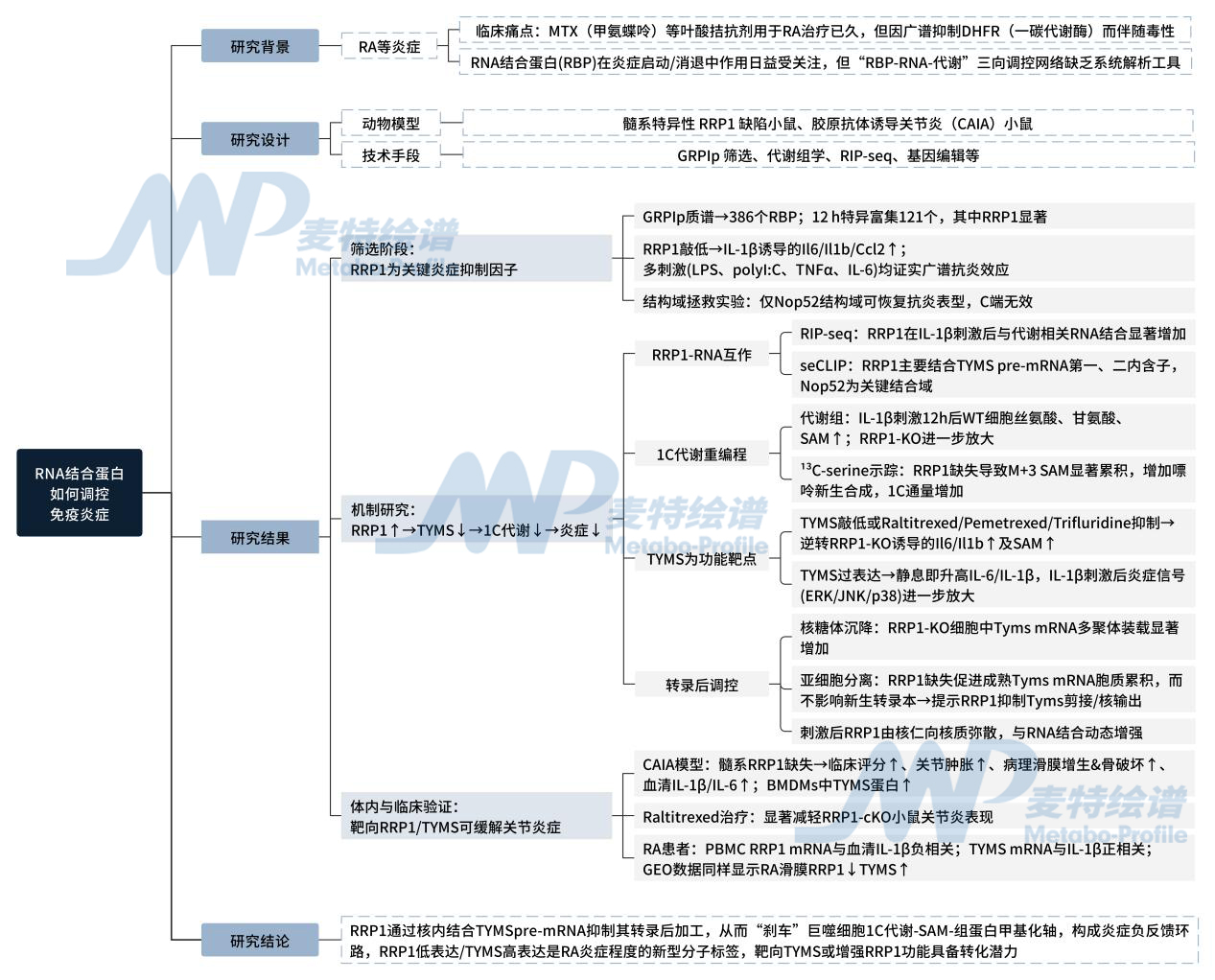 2025年7月,中国医学科学院曹雪涛院士团队在Nature Communications上在线发表了题为“The RNA-binding protein RRP1 brakes macrophage one-carbon metabolism to suppress autoinflammation”的研究文章,通过建立全局RNA-蛋白互作纯化技术(GRPIp),绘制动态RBP图谱,筛选到核仁蛋白RRP1(核糖体RNA加工蛋白1)为强力抗炎因子,结合并抑制TYMS(胸苷酸合酶) mRNA的转录后加工,限制1C代谢及SAM(S-腺苷甲硫氨酸)生成,揭示了RRP1-TYMS-1C代谢轴是潜在抗炎新通路。(麦特绘谱提供非靶向代谢组学+一碳代谢+代谢流([U-13C3]-Serine)技术检测服务)