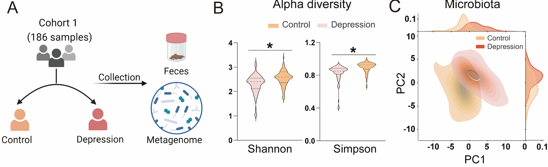 研究团队纳入了四个独立临床队列,涵盖562例血清样本和339例粪便样本,其中包括首诊抑郁症患者、药物治疗后缓解/未缓解患者以及健康对照。通过粪便宏基因组测序、血清靶向代谢组学分析,发现抑郁患者的肠道菌群显著失调,并伴随着血清代谢谱的全面扰动。