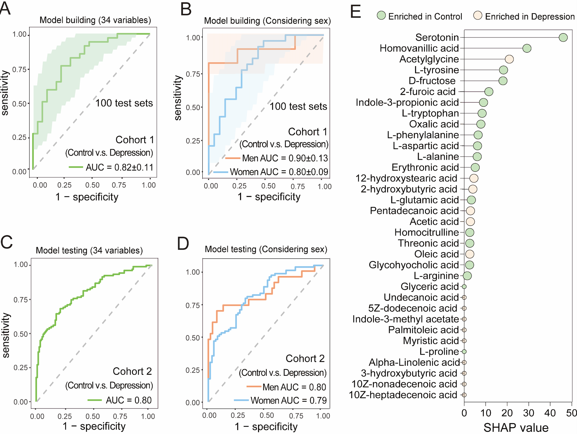 基于上述发现的34种差异代谢物,研究团队利用Gradient Boosting Machine算法构建了抑郁症诊断模型。首诊队列的测试集,该模型的受试者工作特征曲线下面积(AUC)达0.82,表现出优异的区分能力。在独立的验证队列中,模型AUC仍保持在0.80,具有良好的稳定性。该研究首次揭示,通过一次血液检测和代谢分析,即可实现对抑郁症的客观、无创辅助诊断,为临床实践提供了新的可能性和工具。