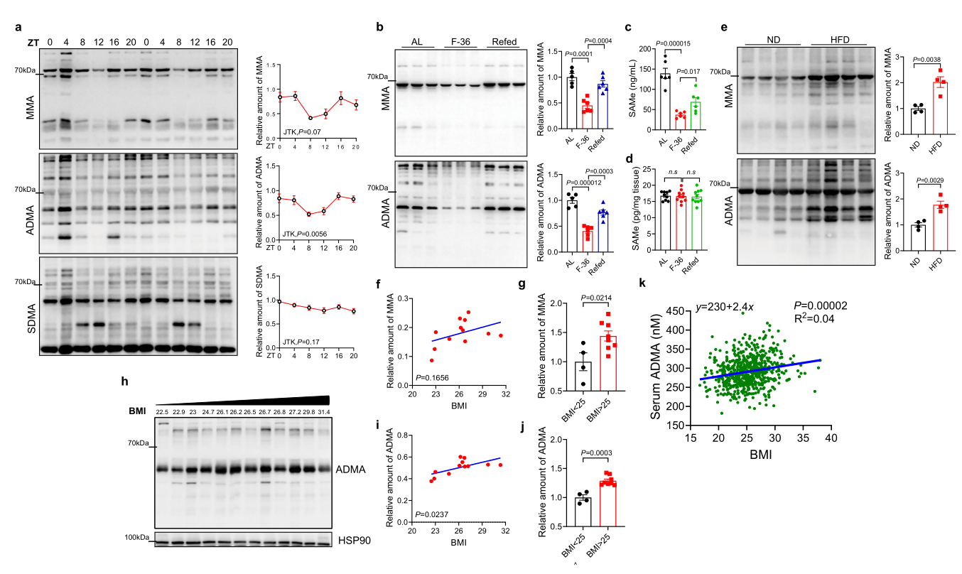 图一. 不对称二甲基精氨酸化水平在内脏脂肪中随进食周期波动并在肥胖个体中积累