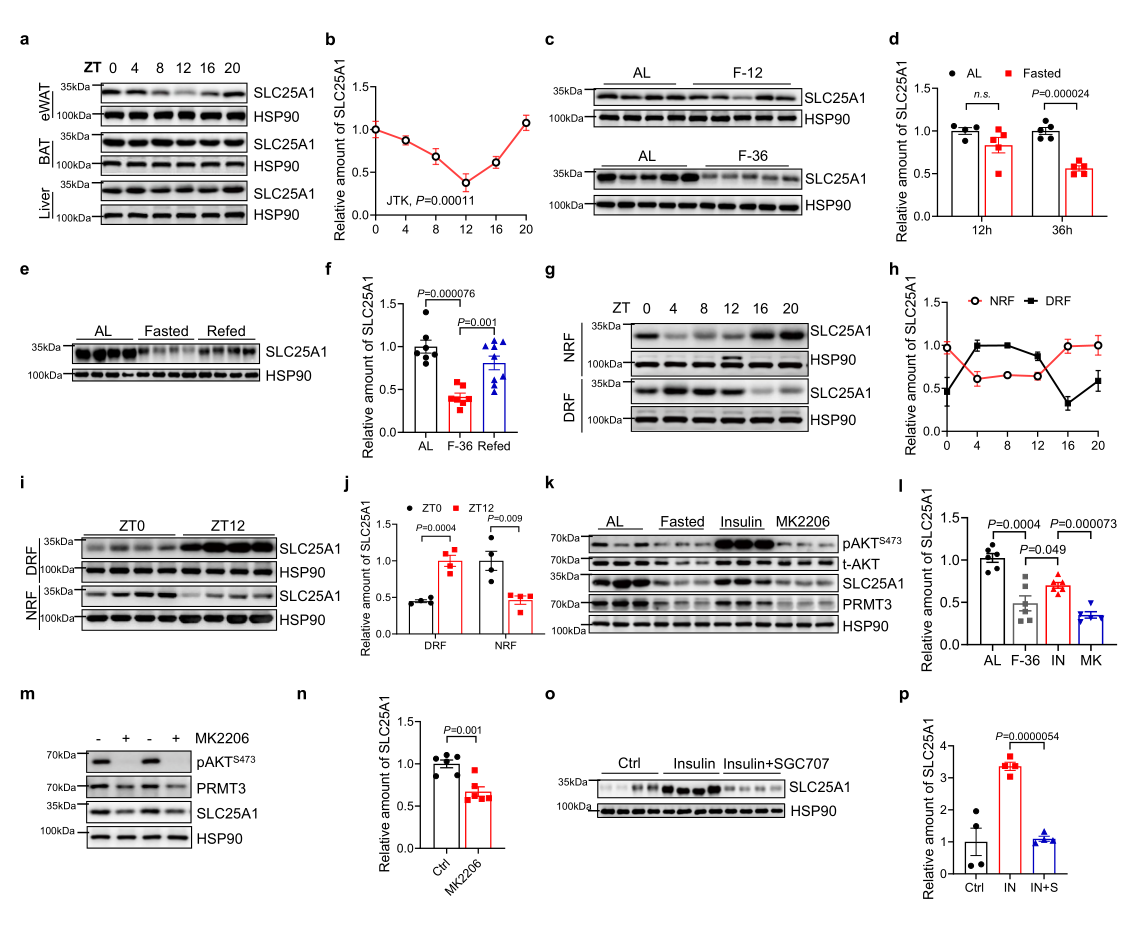 图四. SLC25A1在eWAT中的昼夜表达模式受进食调控,并依赖胰岛素-pAKT信号通路