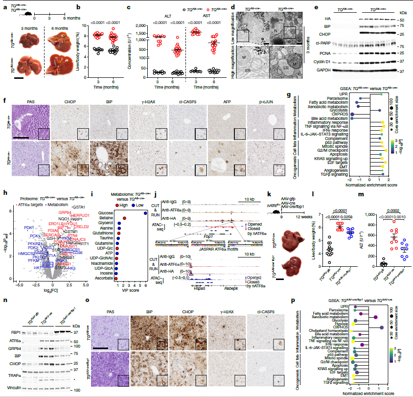 为在活体水平验证上述发现,研究者构建了肝细胞特异性激活ATF6α的转基因小鼠模型(TGAlb-cre+)。与对照组相比,TGAlb-cre+小鼠呈现明显的肝肿大和肝损伤,表现为肝重比增加、血清转氨酶水平升高。透射电子显微镜观察显示,其肝细胞出现明显的内质网肿胀和结构破坏,证实了强烈的内质网应激。分子水平上,未折叠蛋白反应靶标、细胞增殖标志物、DNA损伤标志物及癌胚蛋白AFP的表达均显著上调。转录组和蛋白质组分析进一步揭示,ATF6α的激活上调了未折叠蛋白反应、糖酵解、炎症和致癌信号通路,同时下调了氧化磷酸化和脂肪酸代谢。