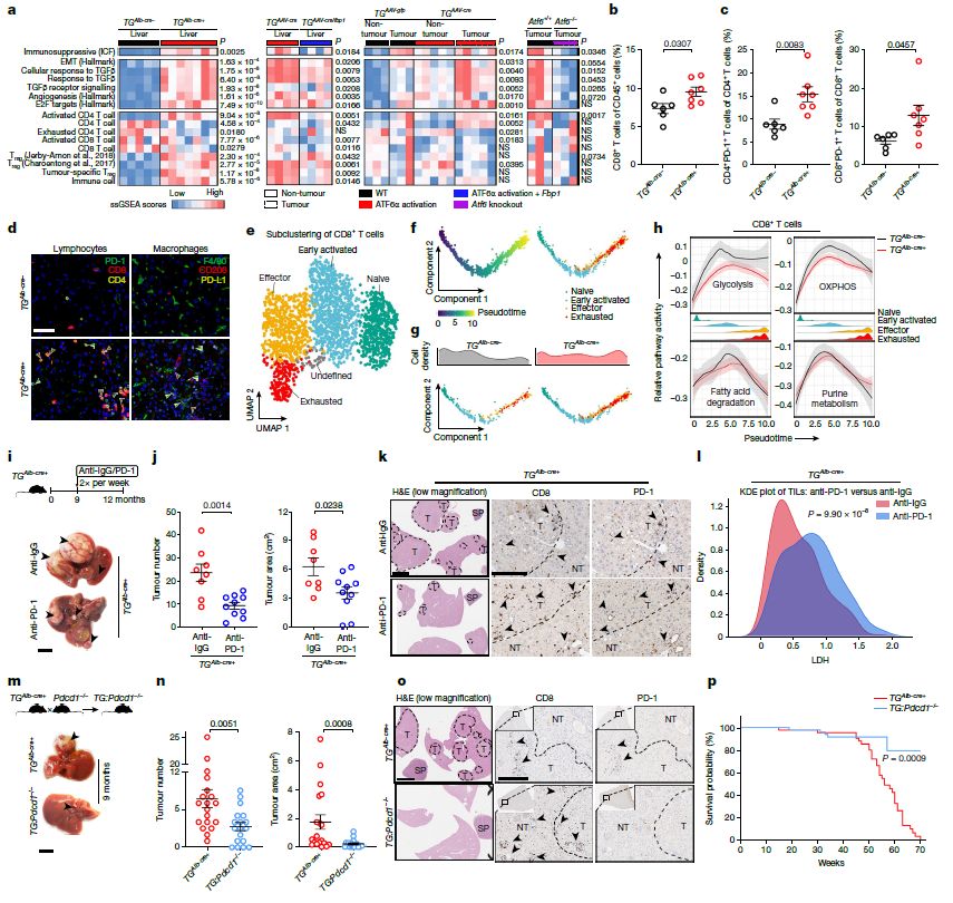 为了验证这一假设,研究者首先对荷瘤TGAlb-cre+小鼠进行抗PD-1抗体治疗。结果显示,阻断PD-1显著减少了肿瘤数量与大小,同时增加了肿瘤内CD8+T细胞浸润及其糖酵解关键酶LDH的表达。进一步地,在原本对ICB不敏感的MYC:TP53KO诱导肝癌模型中,人为激活ATF6α后,肿瘤对后续抗PD-1治疗也转为敏感。最后,通过构建PD-1基因缺失的TGAlb-cre+小鼠模型,从遗传学层面彻底阻断PD-1信号,同样观察到肿瘤发生被抑制、生存期延长的保护效应。