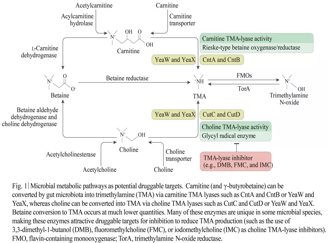 肠道微生物群将含有三甲胺基团的复合物代谢生成三甲胺(TMA),并通过肝脏FMOs进一步氧化为TMAO。膳食-肠道微生物-肝脏共同组成了TMAO的生物合成途径。产生TMA的前体包括TMAO、胆碱、磷脂酰胆碱、肉碱、γ-丁基甜菜碱、甜菜碱、巴豆甜菜碱和甘油磷酰胆碱,这些在鱼、牛肉和鸡蛋中含量非常丰富。参与生成TMA的酶主要有四种:胆碱-TMA裂解酶(cutC/D)、肉碱单氧合酶(cntA/B)、甜菜碱还原酶和TMAO还原酶。此外cntA/B同源酶yeaW/X也可以利用肉碱、胆碱、γ-丁基甜菜碱和甜菜碱生成TMA。