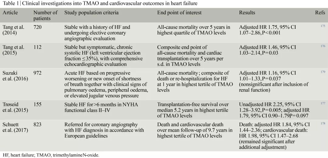 多项临床研究表明,慢性心衰(HF)中TMAO可能通过部分增加心肌纤维化和伴随心肌舒张功能障碍影响HF易感性和发生风险。但问题是,在急性失代偿性HF中,TMAO与不良结局是否存在类似的关系。临床数据表明,将TMAO纳入风险模型结合临床评分可改善院内死亡率的风险分层。此外,血浆TMAO水平与N-末端proBNP水平同时使用可改善预后预测。