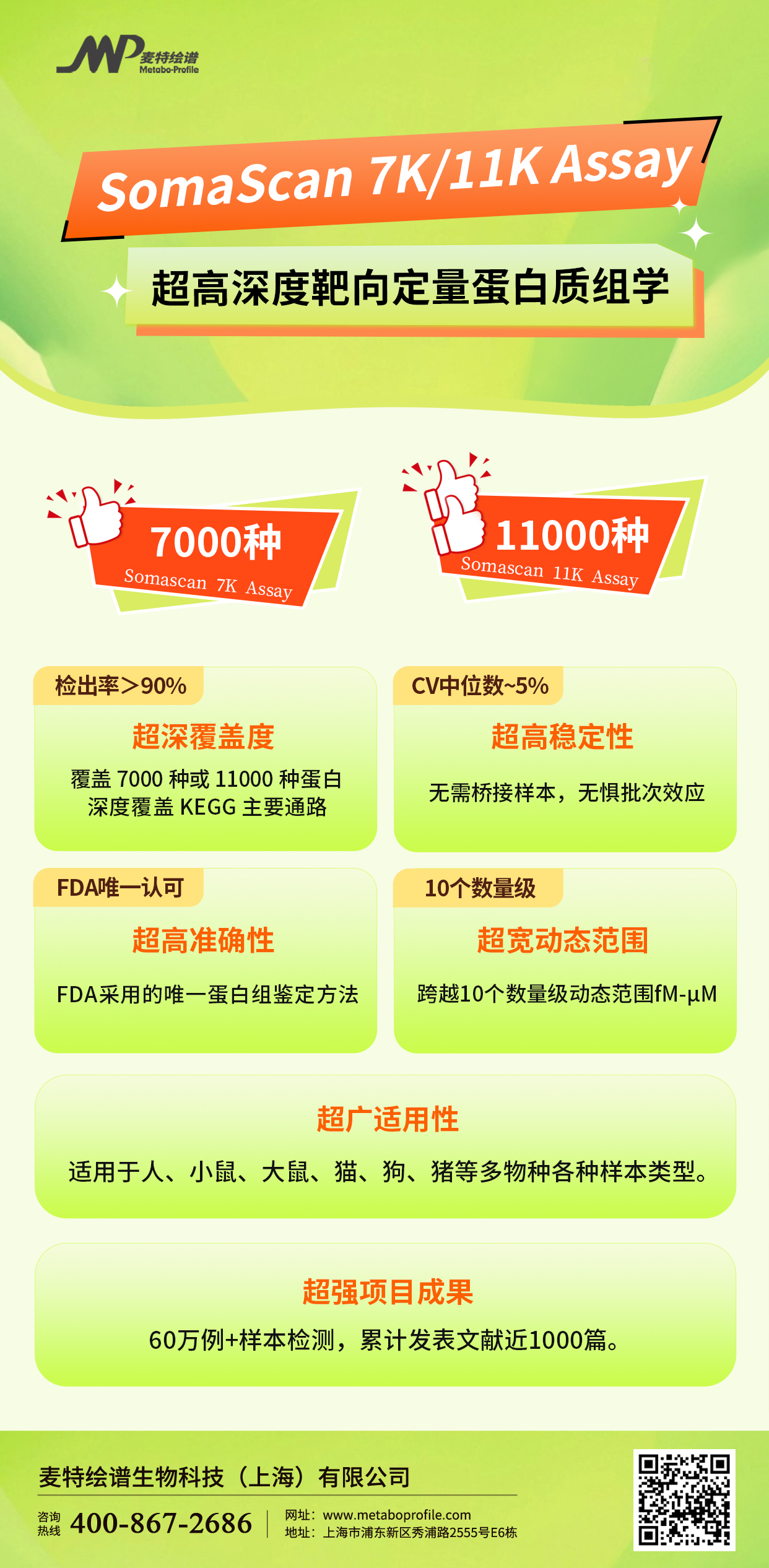 麦特绘谱推出超高深度超高通量靶向蛋白质组7k/11k Assay,实现蛋白检测的深、准、稳三位一体,适用于大队列蛋白质组分析,尤其是血液蛋白质组,旨在从海量蛋白质分子中系统性、无偏向地发现新规律、新靶点、新标志物的研究项目。Somascan 7k/11k Assay与麦特绘谱Q300/Q200/Q500/Q1000全定量代谢组学技术分别从超高深度蛋白组学和超高准确度定量代谢组学层面强强联合,无疑是当前生命医学领域抢占科研制高点的最强搭档!