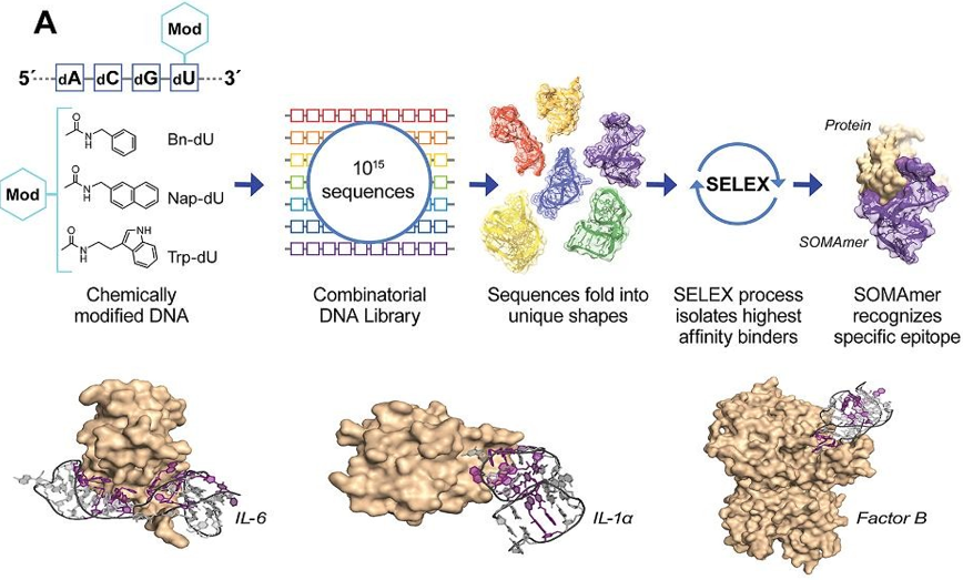 SomaScan技术核心原理——核酸适配体(Aptamer),单链寡核苷酸(80-100个碱基)通过碱基互补配对、氢键等相互作用发生折叠后形成特定的三维SomaScan蛋白组技术原理结构,这种三维结构通过分子其结合解离常数能达到纳摩尔和皮摩尔水平,与单克隆抗体相当。