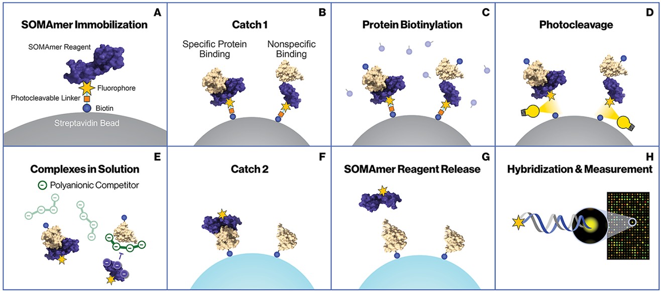 B:捕获:加入样品,SOMAmer结合蛋白,形成蛋白-SOMAmer复合物,从而捕获目标蛋白;