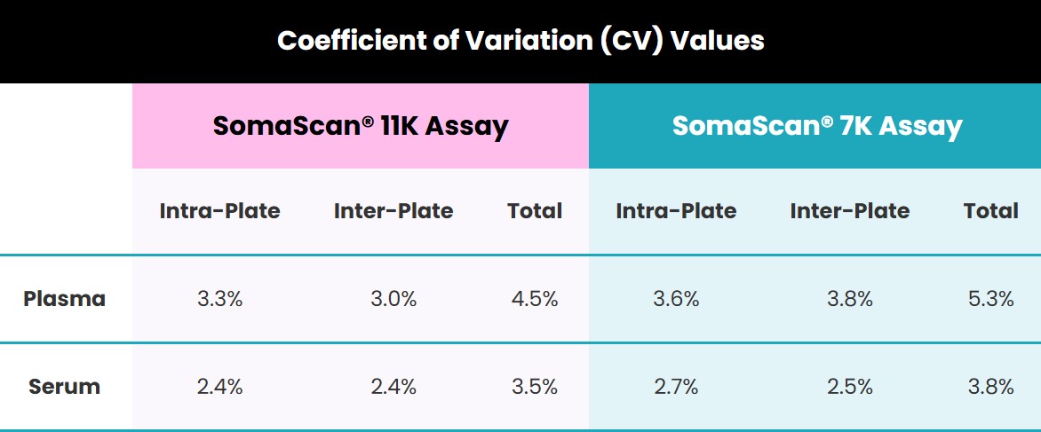 SomaScan由于不依赖可变性高的多克隆抗体,其变异系数远低于行业标准(~5%CV),具有超高定量稳定性,避免了批次效应影响,且不同批次检测无需桥接样本,数据直接合并分析比较,可很好地应用于万人级别的队列研究中,以揭示极小的疾病状态和治疗效果变化,因而可应用于从靶点发现到药物开发全流程生物标志物检测。