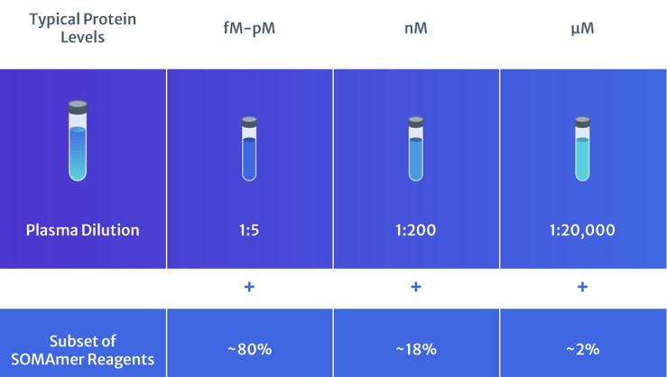 人血清/血浆中蛋白质浓度存在数量级差异,大多数蛋白质组平台测量的蛋白质数量很少,动态范围较窄。SomaScan测量采用连续稀释的方法,无需其它样品预处理,即可检测人血浆或血清中10个数量级动态范围(fM-uM)内的蛋白(如从高峰度的白蛋白到低丰度的白细胞介素或干扰素),有利于发现罕见蛋白质,准确反映高丰度、低丰度蛋白量值变化。