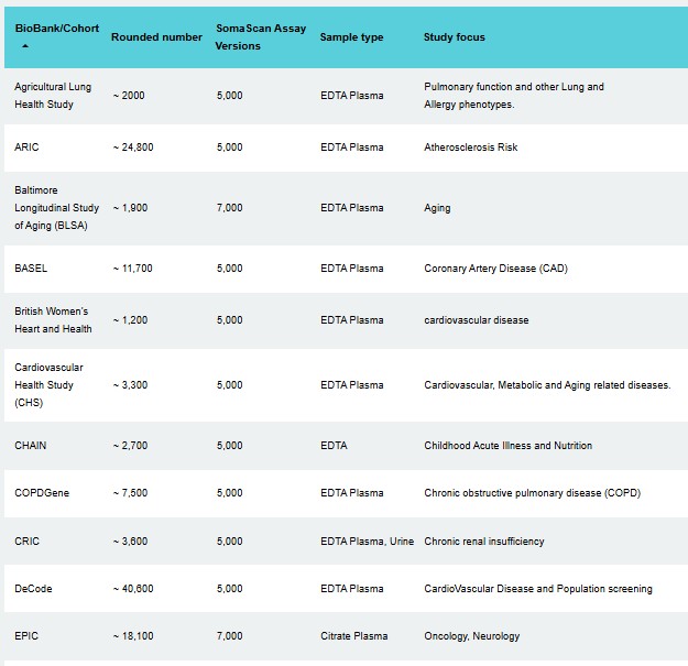 目前SomaScan平台已经分析60万+例样本,累计发表文献1000余篇,参与了大量队列研究,如冰岛人群研究、芬兰人群研究、中国慢病前瞻性队列研究,以及一些专病队列研究如欧洲癌症和营养前瞻性研究,美国动脉硬化研究等。在队列研究中,其采用了GWAS共定位分析、多组学研究等手段,对人群的分布、人群中发病的过程及预测模型、多组学互作网络做出大量的分析,建立了各种模型,为医疗决策作出重要参考。