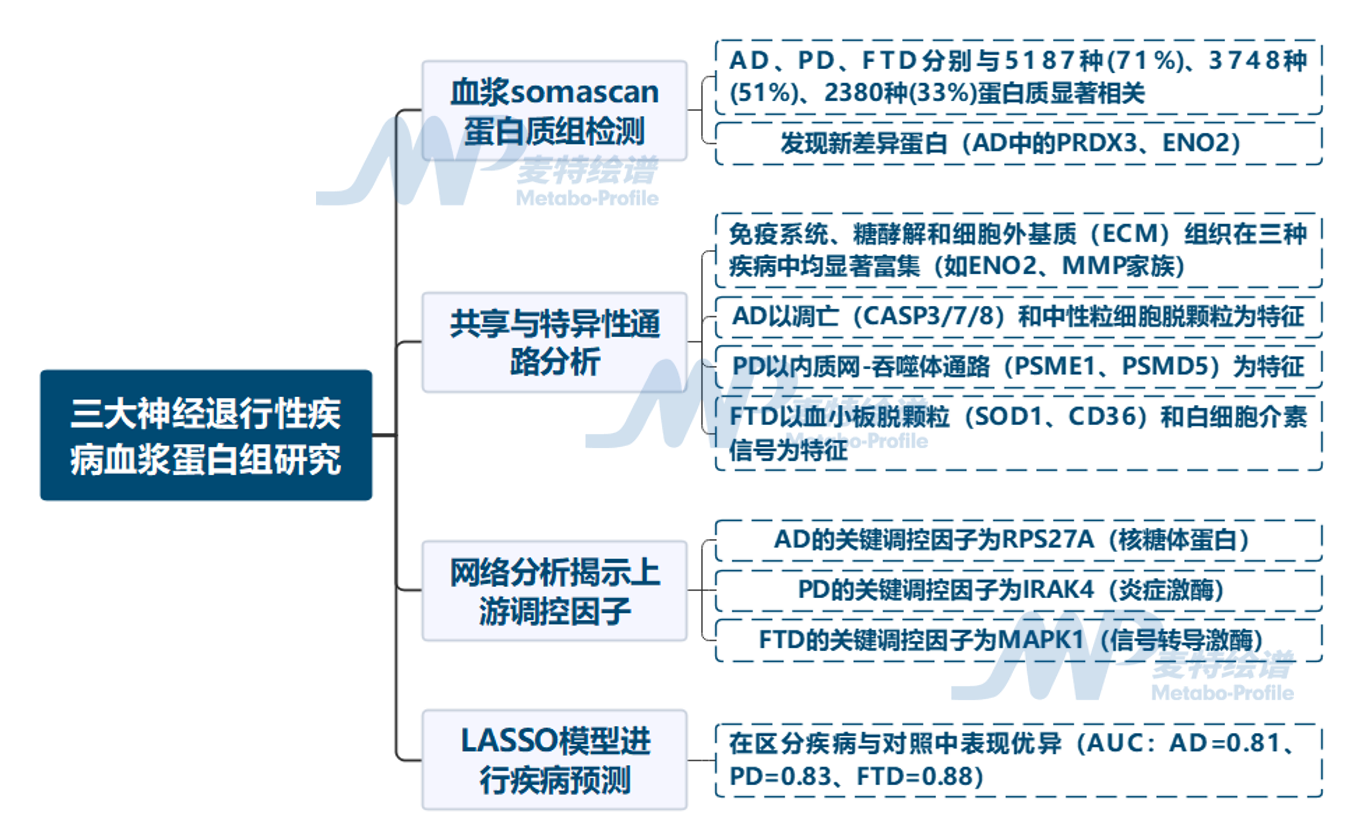 研究结论:本文通过对阿尔茨海默病(AD)、帕金森病(PD)和额颞叶痴呆(FTD)的血浆蛋白质组学分析,探究了三种神经退行性疾病的分子特征。网络分析发现了AD中RPS27A、PD中IRAK4、FTD中MAPK1等关键调控蛋白。基于血浆的疾病特异性预测模型表现出较好的鉴别能力(AUC分别为 0.81、0.83、0.88),且具有疾病特异性,为这些疾病的诊断及新生物标志物开发提供了依据。